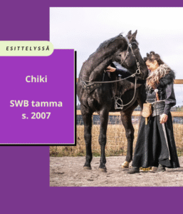 CHIKI 2007 syntynyt swb tamma, kisannut GP esteratoja. Säkä 162 cm, musta kaunotar. Chiki on kiltti mutta herkkä ja vauhdikas mammatamma, jolle sopii kokeneet kuskit. Maasta käsin hän on tosi kiltti ja jo jonkin verran osaava akateemisen ratsastuksen maastakäsin taitojen suhteen. Painoraja 75 kg.